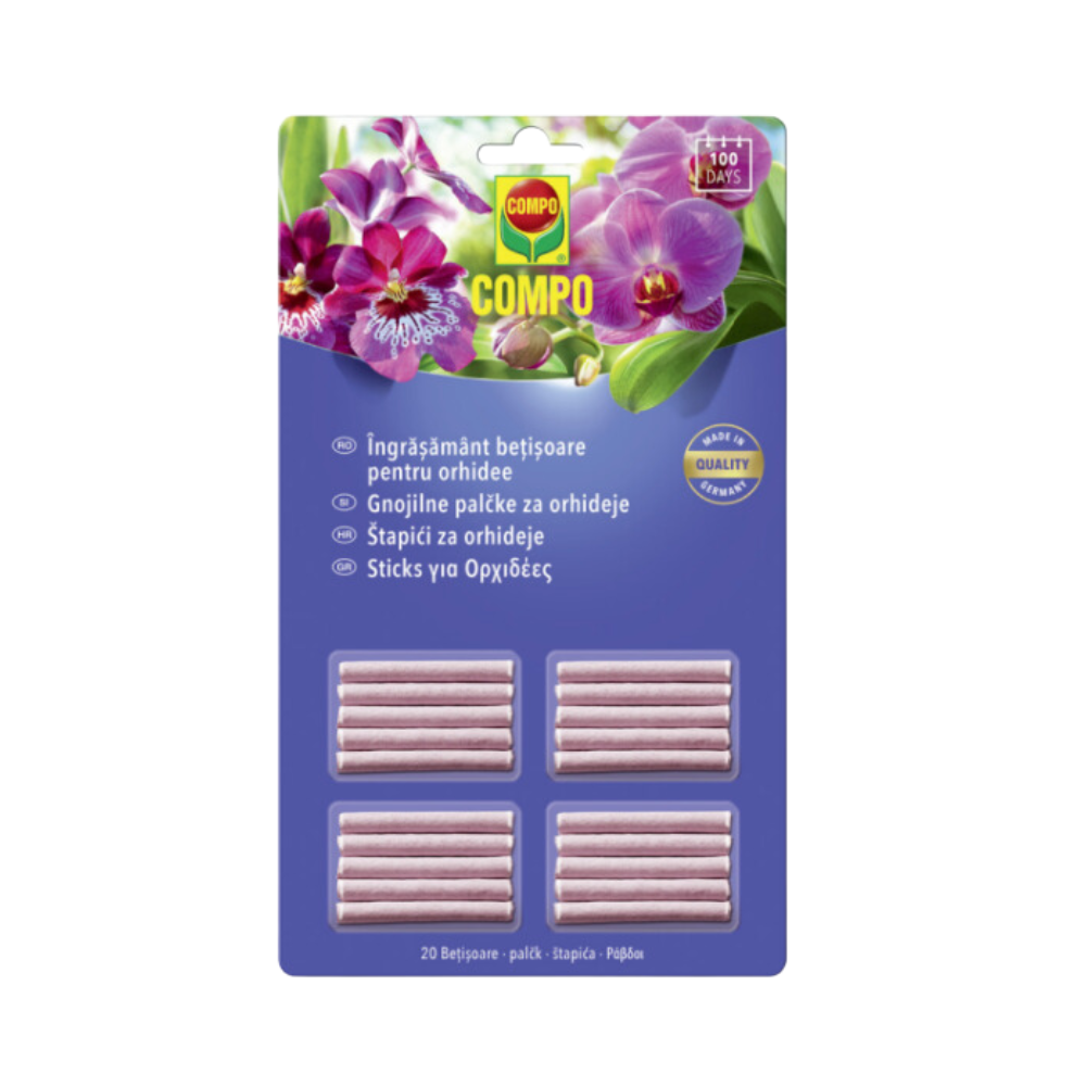 Τα COMPO Sticks για Ορχιδέες προσφέρουν μακράς διάρκειας λίπανση με κάθε μπαστουνάκι να απελευθερώνει σταδιακά τα απαραίτητα θρεπτικά συστατικά, εξασφαλίζοντας πλούσια άνθη, υγιή φύλλα και δυνατές ρίζες. Είναι ειδικά σχεδιασμένα για όλες τις ποικιλίες ορχιδέας που καλλιεργούνται σε γλάστρες, παρέχοντας μέχρι και 3 μήνες συνεχούς φροντίδας.